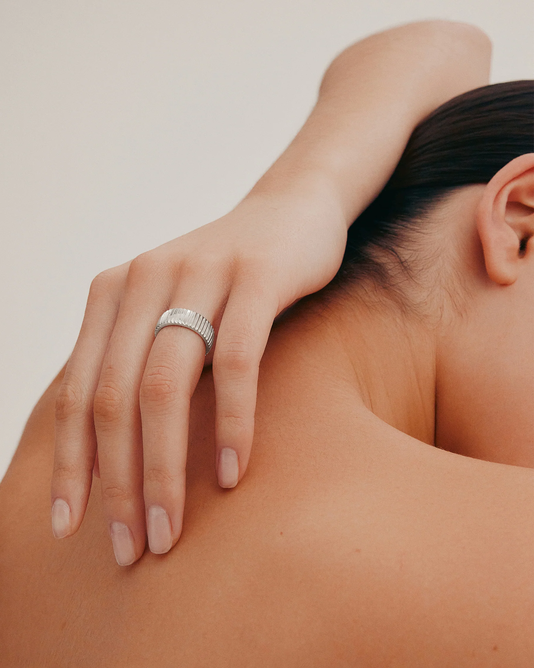 Handcrafted in sterling silver, the Bold Scale Ring features a cog-inspired, tiered pattern that creates a kinetic play of light. Designed as a genderless piece, it makes a striking choice for a wedding band or a bold everyday ring.