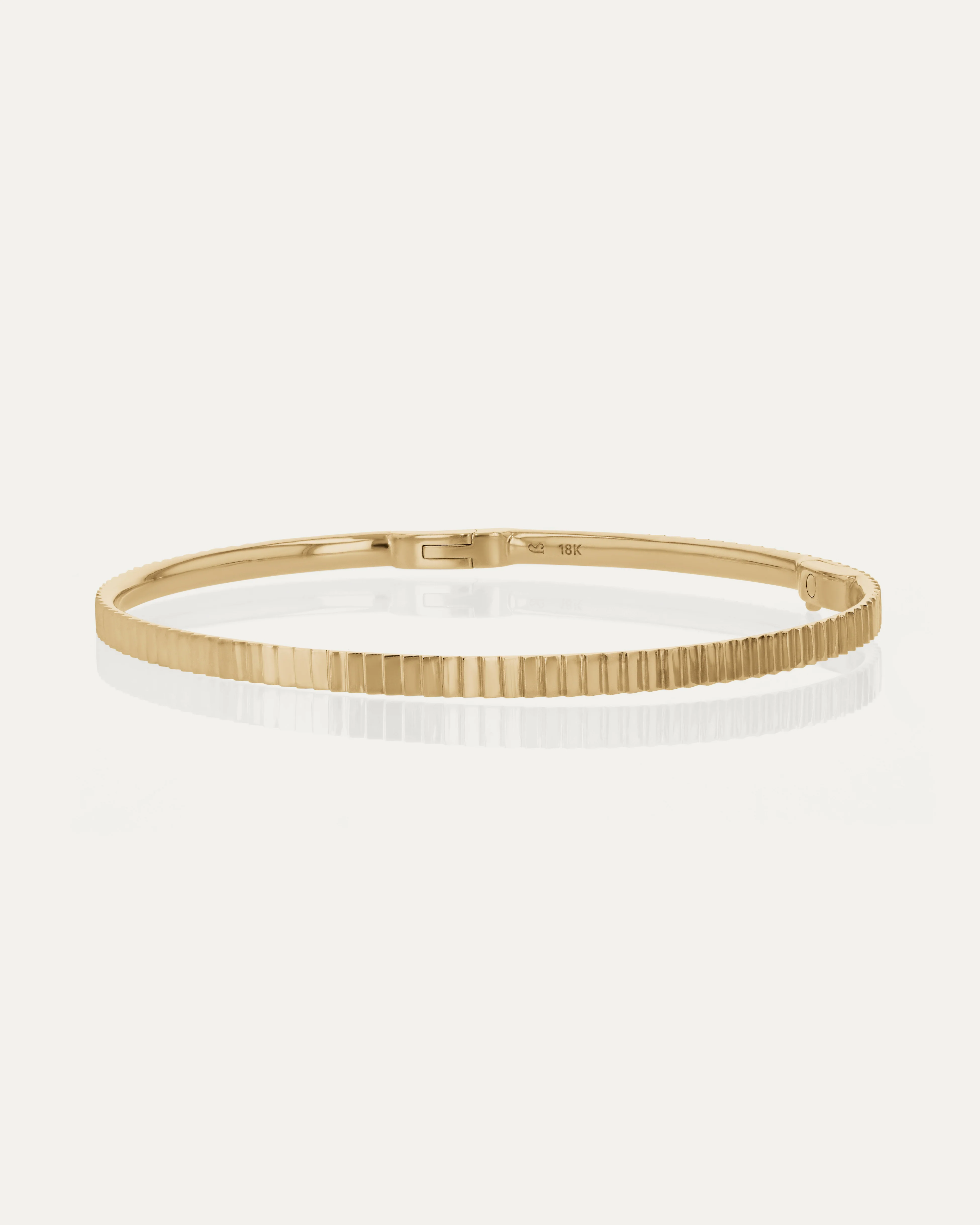 The Scale Bangle is an architectural piece designed for minimalist styling. Polished in 18-karat solid yellow gold, it features a tactile scaled finish creating a kinetic play of light with every movement.