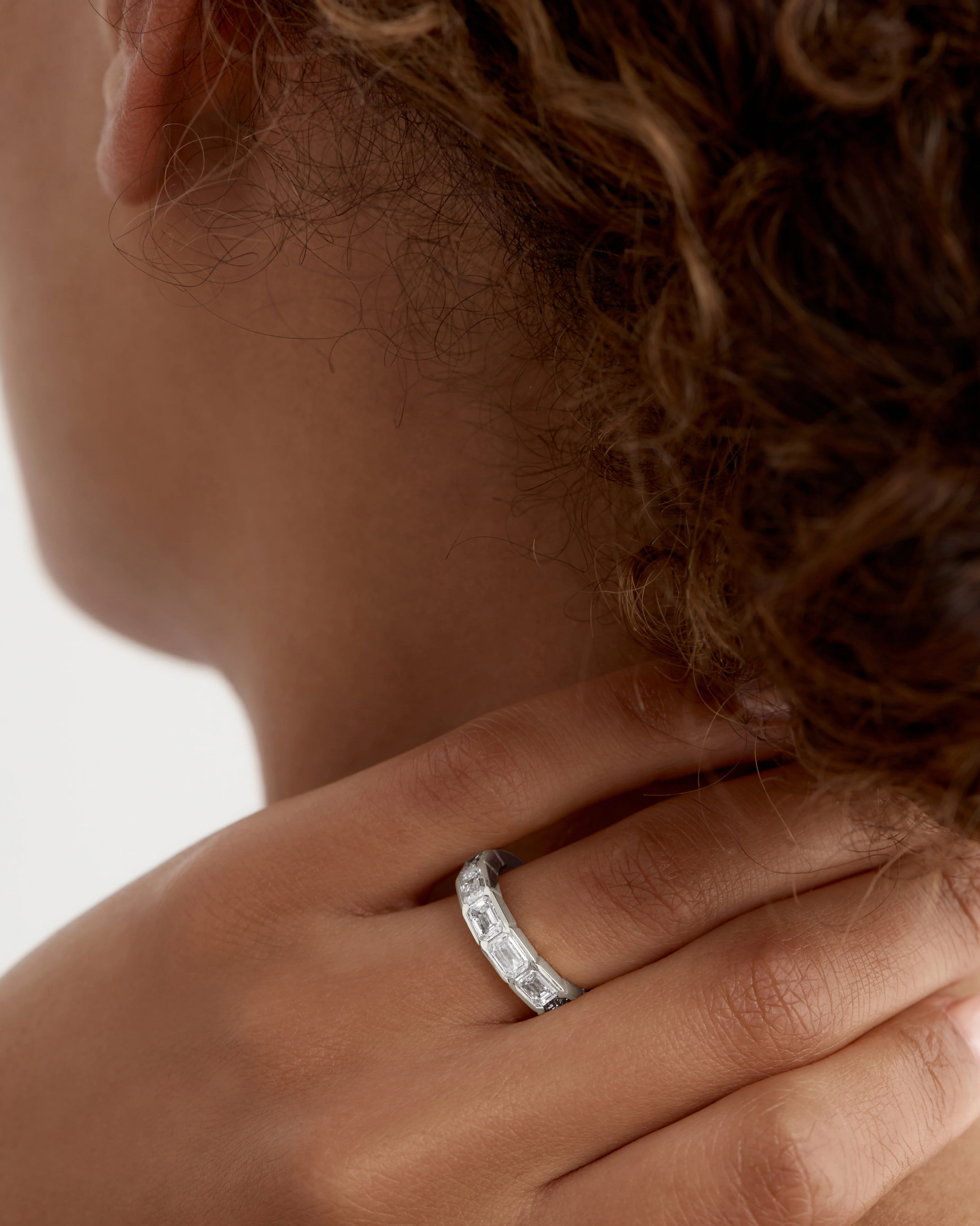 A sleek and polished wedding band or elevated layering piece featuring uniform emerald-cut diamonds set horizontally along 3/4 of an 18-karat gold band in a tension-style suspense setting.